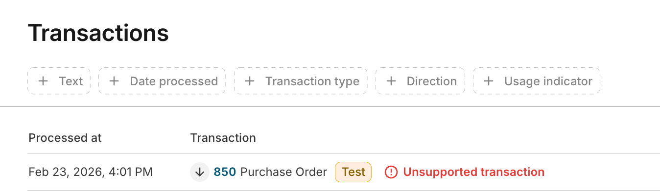 The Stedi portal’s Transactions page now displays a warning when unsupported X12 transactions are submitted or received over SFTP.