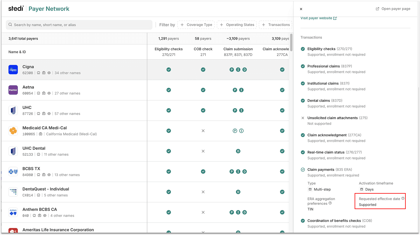 In Payers API responses, check the requestedEffectiveDate field in the claimPayment enrollment process to determine support. The field is omitted when Stedi has yet to determine a payer's support for requested effective dates.