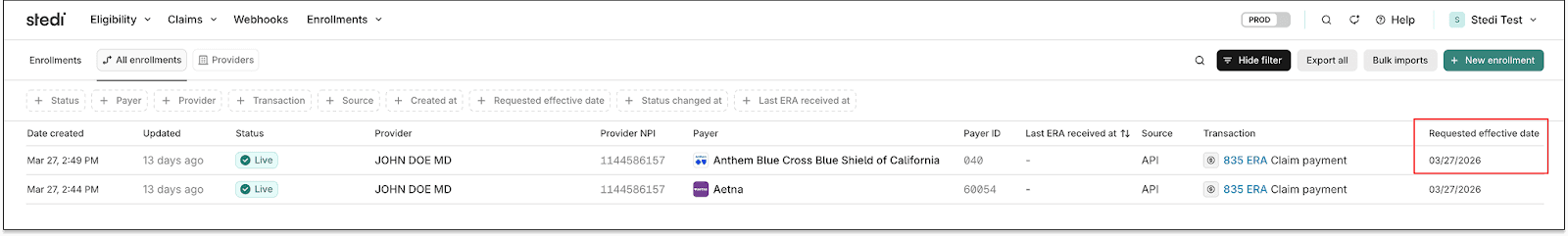Not all payers support requested effective dates. You can check whether a payer supports them using the Payers API or the Stedi Payer Network before submitting an enrollment request.