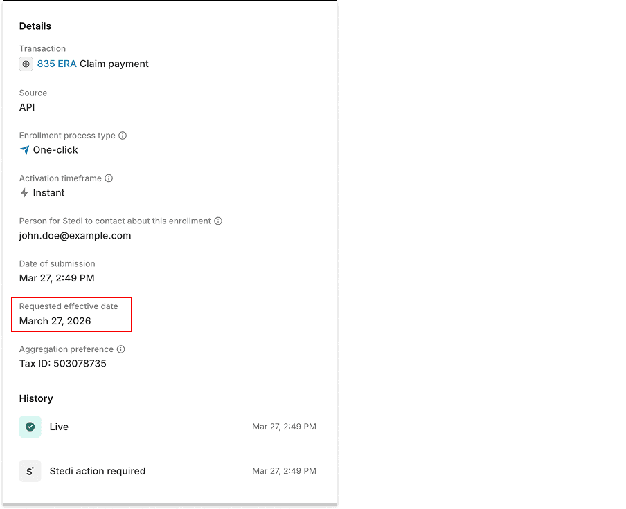You can now set an optional requested effective date on ERA transaction enrollment requests. This date tells the payer when you'd like them to start routing ERAs to Stedi.