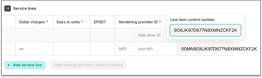 When submitting a claim using the Stedi portal’s CMS-1500 form, click Set manual line item control numbers in the service lines table to reveal the Line Item Control Number field for each service line.