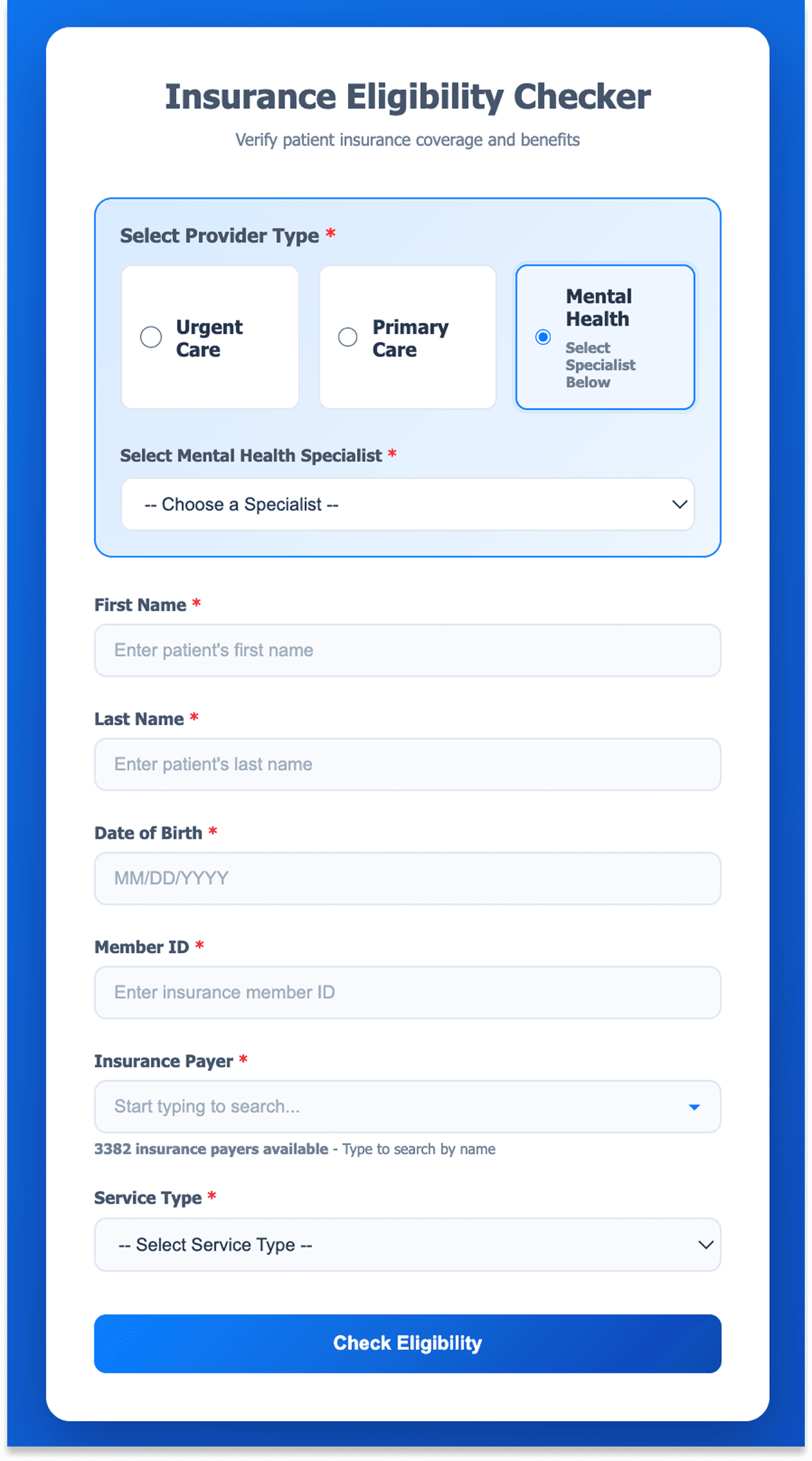 To check insurance, on-site staff only need to enter six fields: first name, last name, date of birth, member ID, insurance name, and service type.